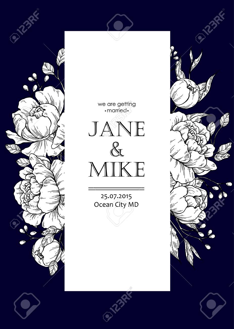 Dark Blue Wedding Invitation Card Template With Vector Peony